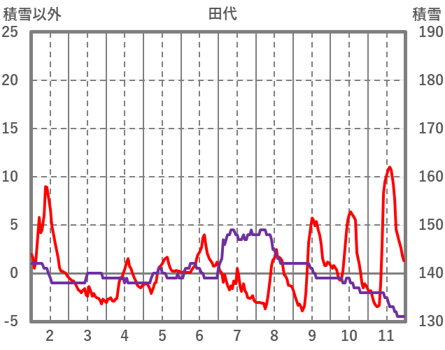 | 日 | 時 | 気温 | 降水 | 風向/風速 | 日照 | 積雪 | 降雪 |