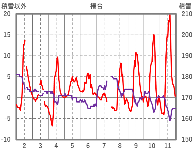 | 日 | 時 | 気温 | 降水 | 風向/風速 | 日照 | 積雪 | 降雪 |
