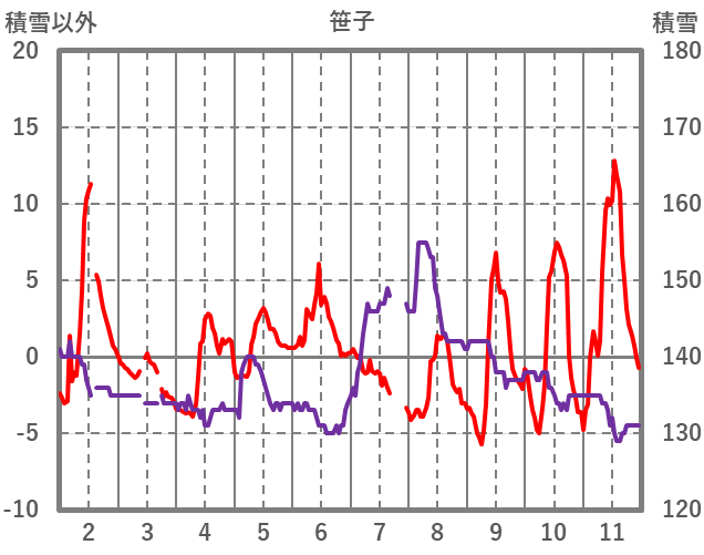 | 日 | 時 | 気温 | 降水 | 風向/風速 | 日照 | 積雪 | 降雪 |
