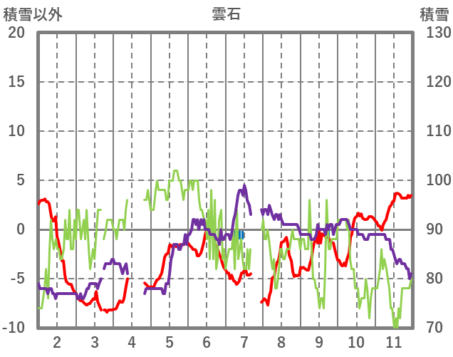 | 日 | 時 | 気温 | 降水 | 風向/風速 | 日照 | 積雪 | 降雪 |