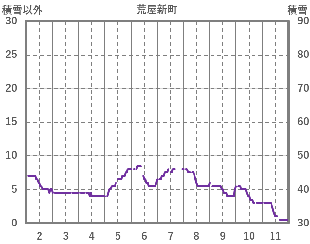 | 日 | 時 | 気温 | 降水 | 風向/風速 | 日照 | 積雪 | 降雪 |