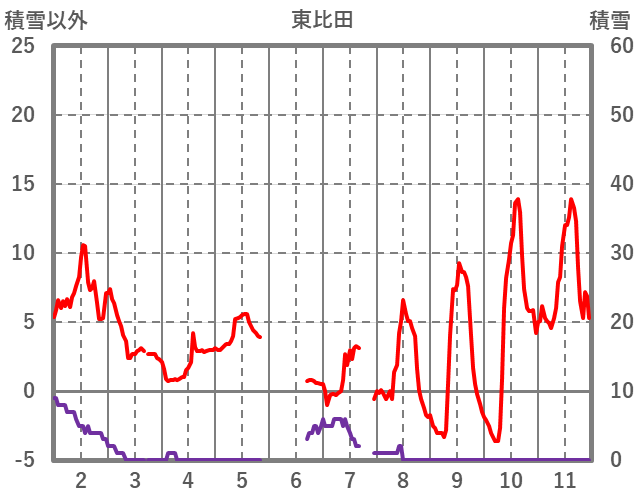 | 日 | 時 | 気温 | 降水 | 風向/風速 | 日照 | 積雪 | 降雪 |