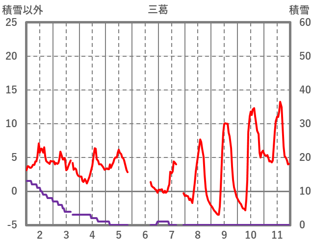| 日 | 時 | 気温 | 降水 | 風向/風速 | 日照 | 積雪 | 降雪 |