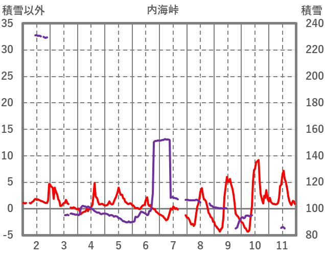 | 日 | 時 | 気温 | 降水 | 風向/風速 | 日照 | 積雪 | 降雪 |