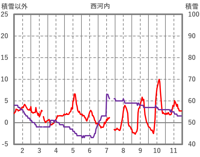 | 日 | 時 | 気温 | 降水 | 風向/風速 | 日照 | 積雪 | 降雪 |