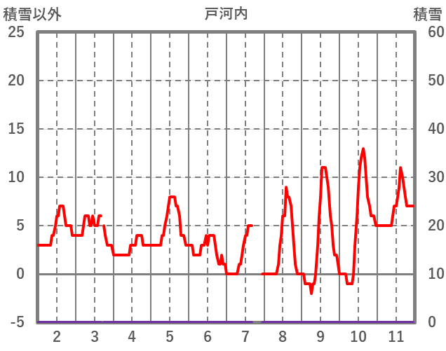 | 日 | 時 | 気温 | 降水 | 風向/風速 | 日照 | 積雪 | 降雪 |