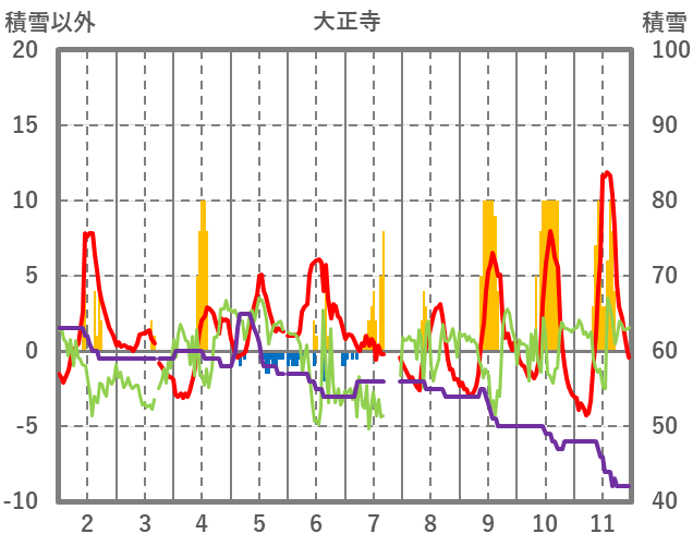 | 日 | 時 | 気温 | 降水 | 風向/風速 | 日照 | 積雪 | 降雪 |