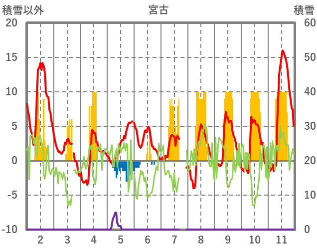 | 日 | 時 | 気温 | 降水 | 風向/風速 | 日照 | 積雪 | 降雪 |