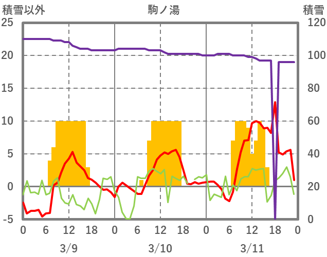 | 日 | 時 | 気温 | 降水 | 風向/風速 | 日照 | 積雪 | 降雪 |