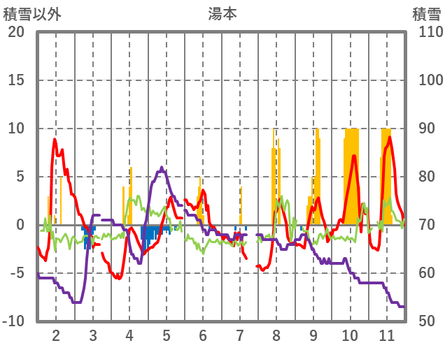 | 日 | 時 | 気温 | 降水 | 風向/風速 | 日照 | 積雪 | 降雪 |