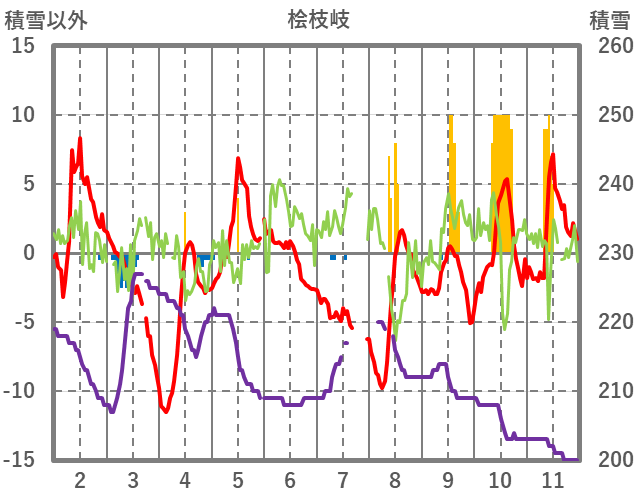 | 日 | 時 | 気温 | 降水 | 風向/風速 | 日照 | 積雪 | 降雪 |