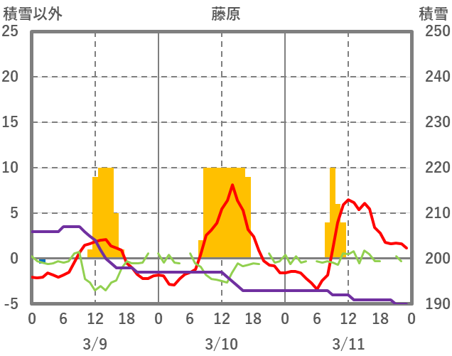 | 日 | 時 | 気温 | 降水 | 風向/風速 | 日照 | 積雪 | 降雪 |