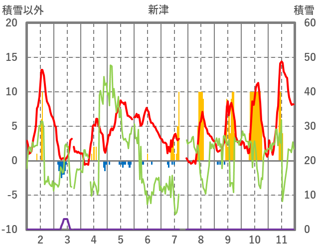 | 日 | 時 | 気温 | 降水 | 風向/風速 | 日照 | 積雪 | 降雪 |