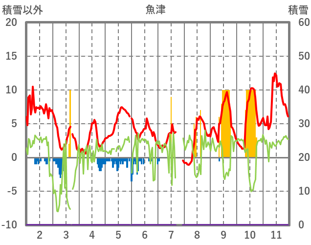 | 日 | 時 | 気温 | 降水 | 風向/風速 | 日照 | 積雪 | 降雪 |