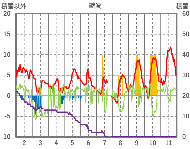 | 日 | 時 | 気温 | 降水 | 風向/風速 | 日照 | 積雪 | 降雪 |