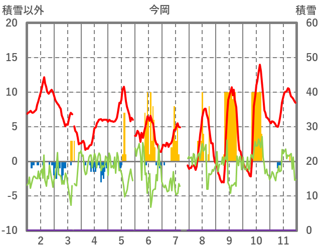 | 日 | 時 | 気温 | 降水 | 風向/風速 | 日照 | 積雪 | 降雪 |