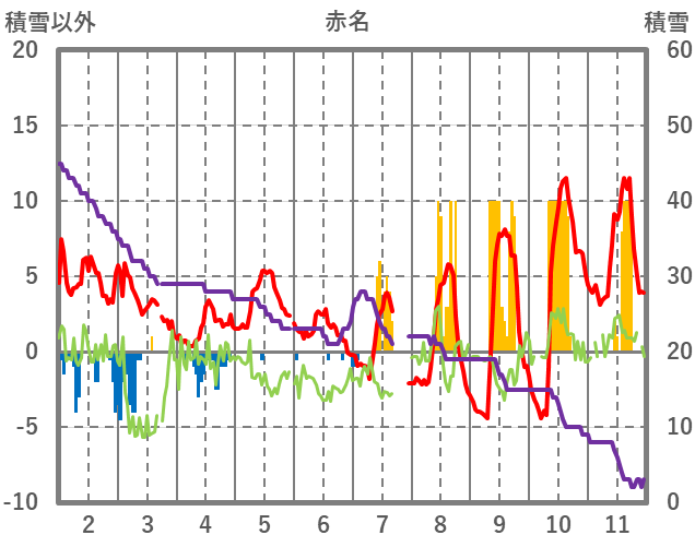 | 日 | 時 | 気温 | 降水 | 風向/風速 | 日照 | 積雪 | 降雪 |