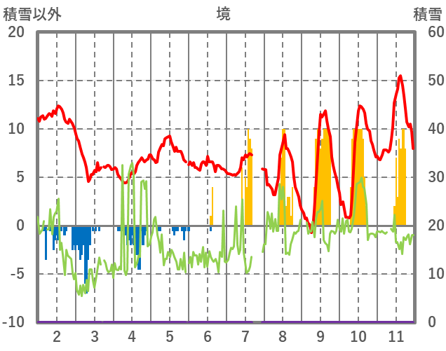 | 日 | 時 | 気温 | 降水 | 風向/風速 | 日照 | 積雪 | 降雪 |