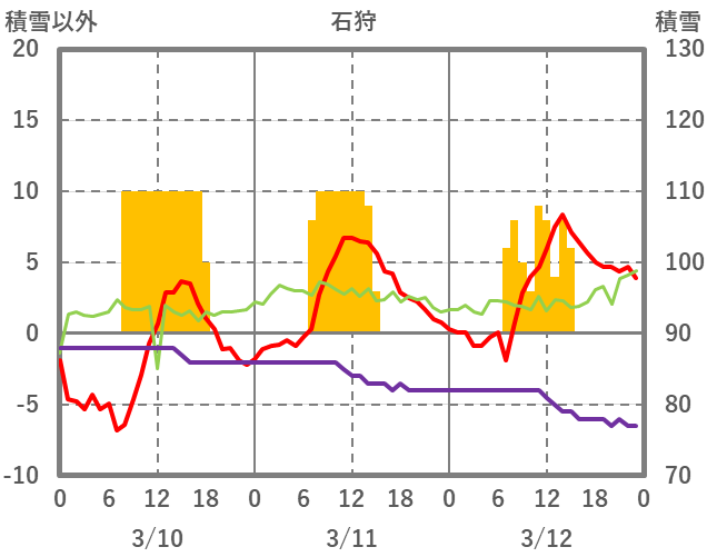 | 日 | 時 | 気温 | 降水 | 風向/風速 | 日照 | 積雪 | 降雪 |