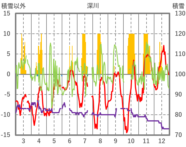 | 日 | 時 | 気温 | 降水 | 風向/風速 | 日照 | 積雪 | 降雪 |