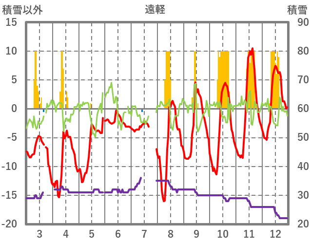 | 日 | 時 | 気温 | 降水 | 風向/風速 | 日照 | 積雪 | 降雪 |