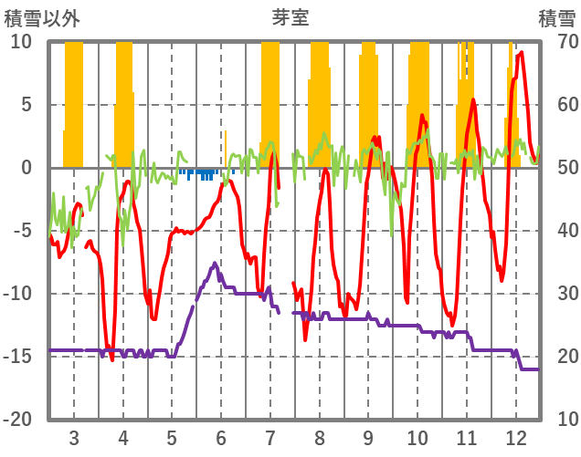 | 日 | 時 | 気温 | 降水 | 風向/風速 | 日照 | 積雪 | 降雪 |