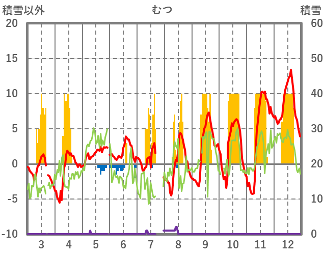 | 日 | 時 | 気温 | 降水 | 風向/風速 | 日照 | 積雪 | 降雪 |