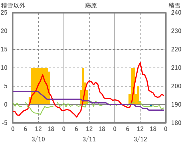 | 日 | 時 | 気温 | 降水 | 風向/風速 | 日照 | 積雪 | 降雪 |
