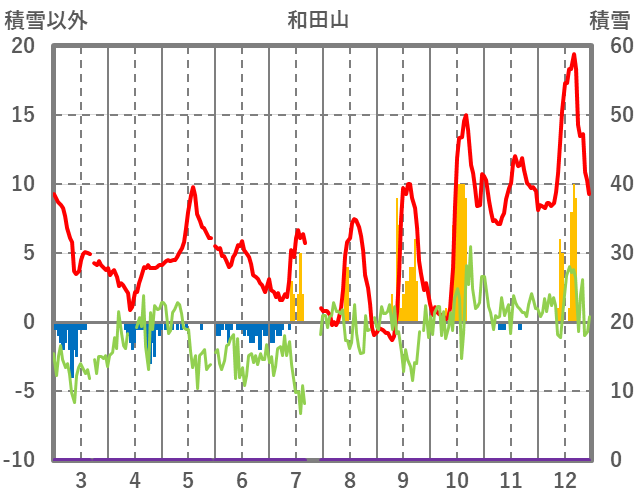 | 日 | 時 | 気温 | 降水 | 風向/風速 | 日照 | 積雪 | 降雪 |