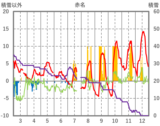 | 日 | 時 | 気温 | 降水 | 風向/風速 | 日照 | 積雪 | 降雪 |