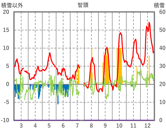 | 日 | 時 | 気温 | 降水 | 風向/風速 | 日照 | 積雪 | 降雪 |