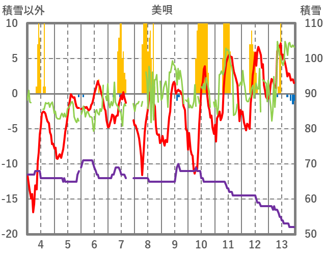 | 日 | 時 | 気温 | 降水 | 風向/風速 | 日照 | 積雪 | 降雪 |