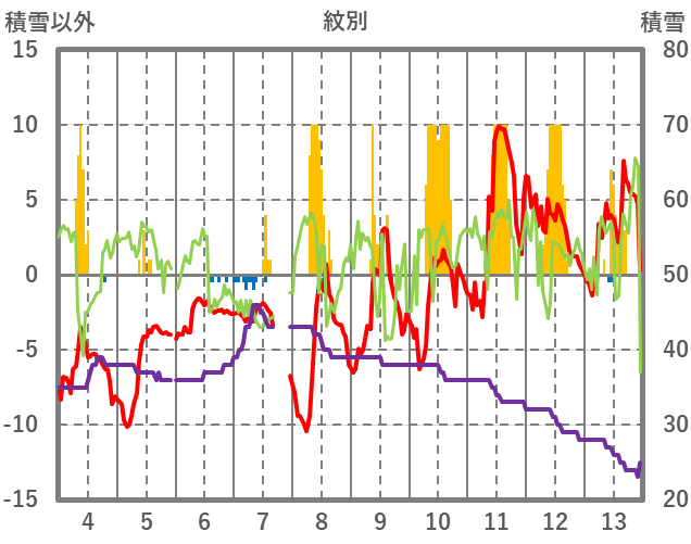 | 日 | 時 | 気温 | 降水 | 風向/風速 | 日照 | 積雪 | 降雪 |