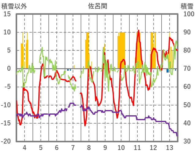 | 日 | 時 | 気温 | 降水 | 風向/風速 | 日照 | 積雪 | 降雪 |