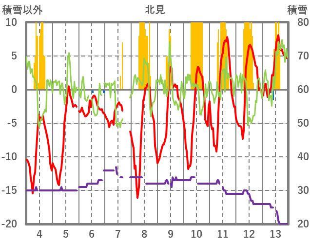 | 日 | 時 | 気温 | 降水 | 風向/風速 | 日照 | 積雪 | 降雪 |