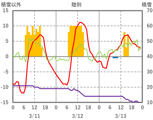 | 日 | 時 | 気温 | 降水 | 風向/風速 | 日照 | 積雪 | 降雪 |