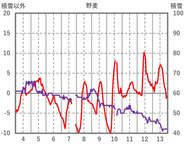 | 日 | 時 | 気温 | 降水 | 風向/風速 | 日照 | 積雪 | 降雪 |