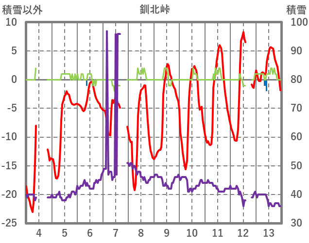 | 日 | 時 | 気温 | 降水 | 風向/風速 | 日照 | 積雪 | 降雪 |