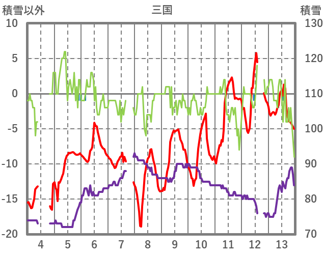 | 日 | 時 | 気温 | 降水 | 風向/風速 | 日照 | 積雪 | 降雪 |