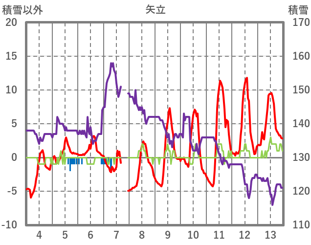 | 日 | 時 | 気温 | 降水 | 風向/風速 | 日照 | 積雪 | 降雪 |