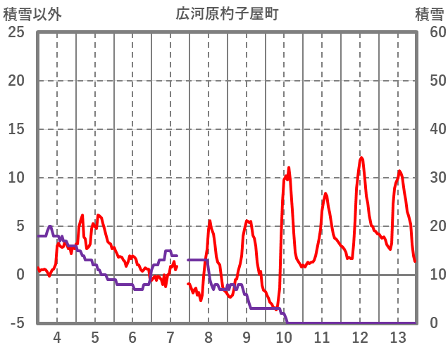 | 日 | 時 | 気温 | 降水 | 風向/風速 | 日照 | 積雪 | 降雪 |