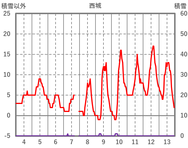 | 日 | 時 | 気温 | 降水 | 風向/風速 | 日照 | 積雪 | 降雪 |