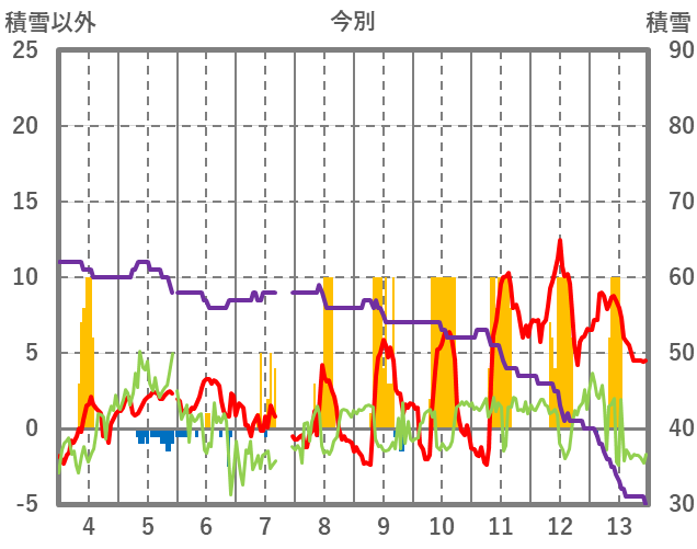 | 日 | 時 | 気温 | 降水 | 風向/風速 | 日照 | 積雪 | 降雪 |