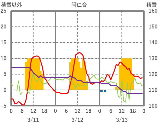| 日 | 時 | 気温 | 降水 | 風向/風速 | 日照 | 積雪 | 降雪 |