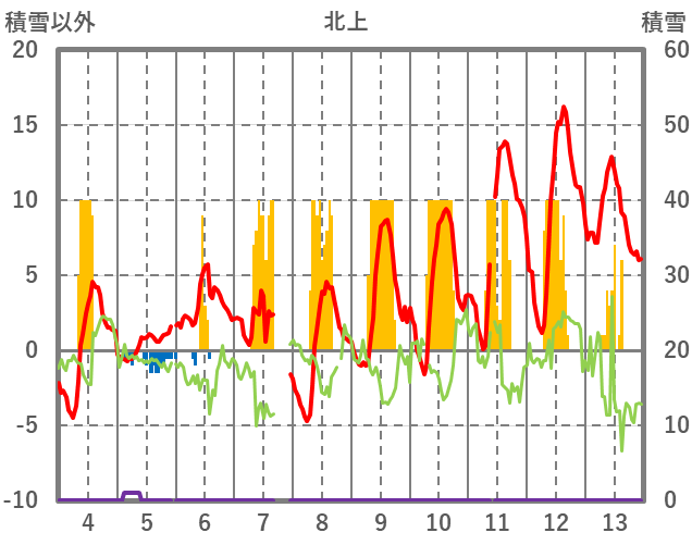 | 日 | 時 | 気温 | 降水 | 風向/風速 | 日照 | 積雪 | 降雪 |