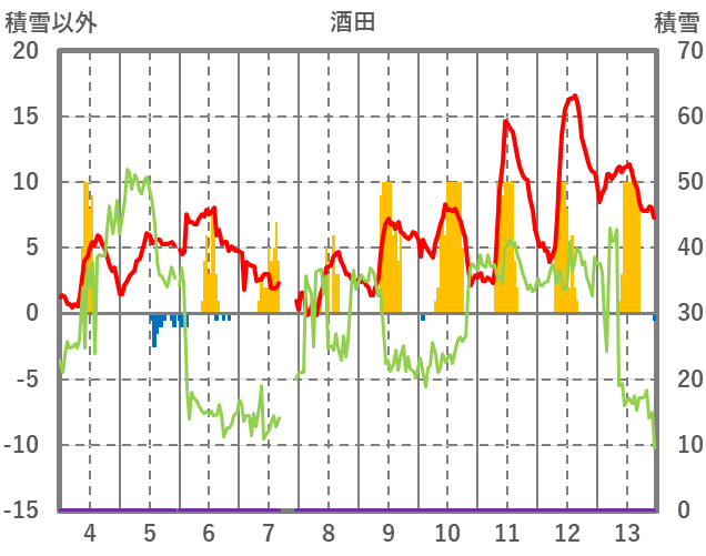 | 日 | 時 | 気温 | 降水 | 風向/風速 | 日照 | 積雪 | 降雪 |