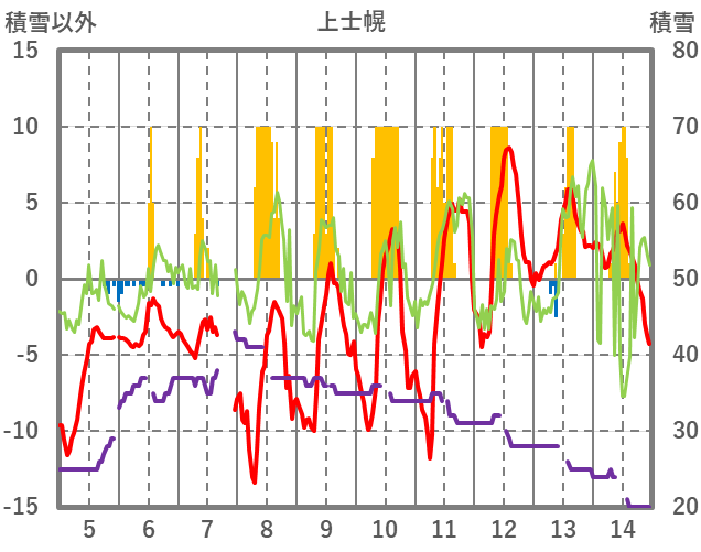 | 日 | 時 | 気温 | 降水 | 風向/風速 | 日照 | 積雪 | 降雪 |