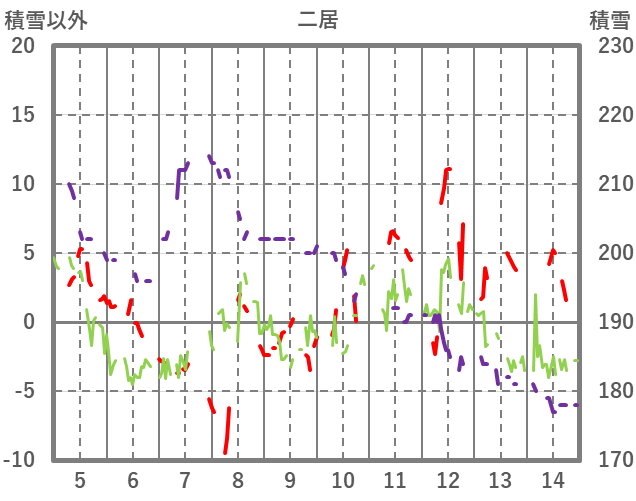 | 日 | 時 | 気温 | 降水 | 風向/風速 | 日照 | 積雪 | 降雪 |