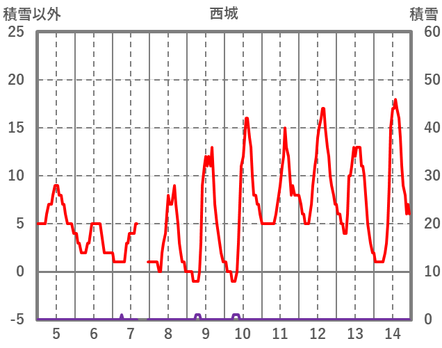 | 日 | 時 | 気温 | 降水 | 風向/風速 | 日照 | 積雪 | 降雪 |