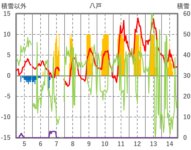 | 日 | 時 | 気温 | 降水 | 風向/風速 | 日照 | 積雪 | 降雪 |